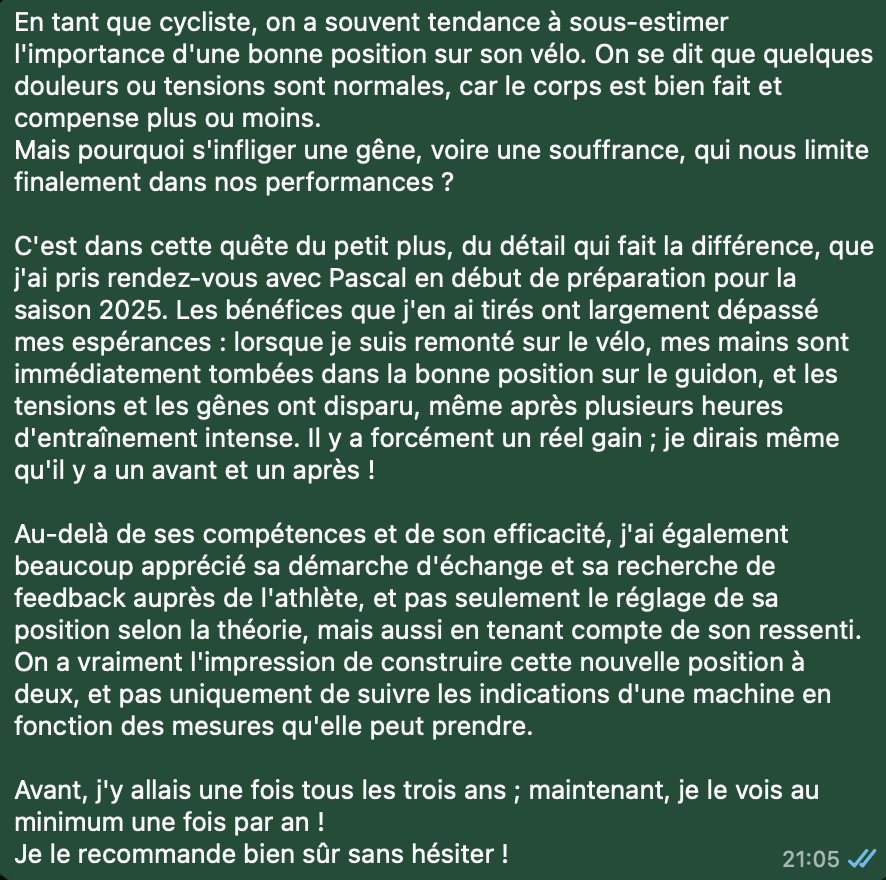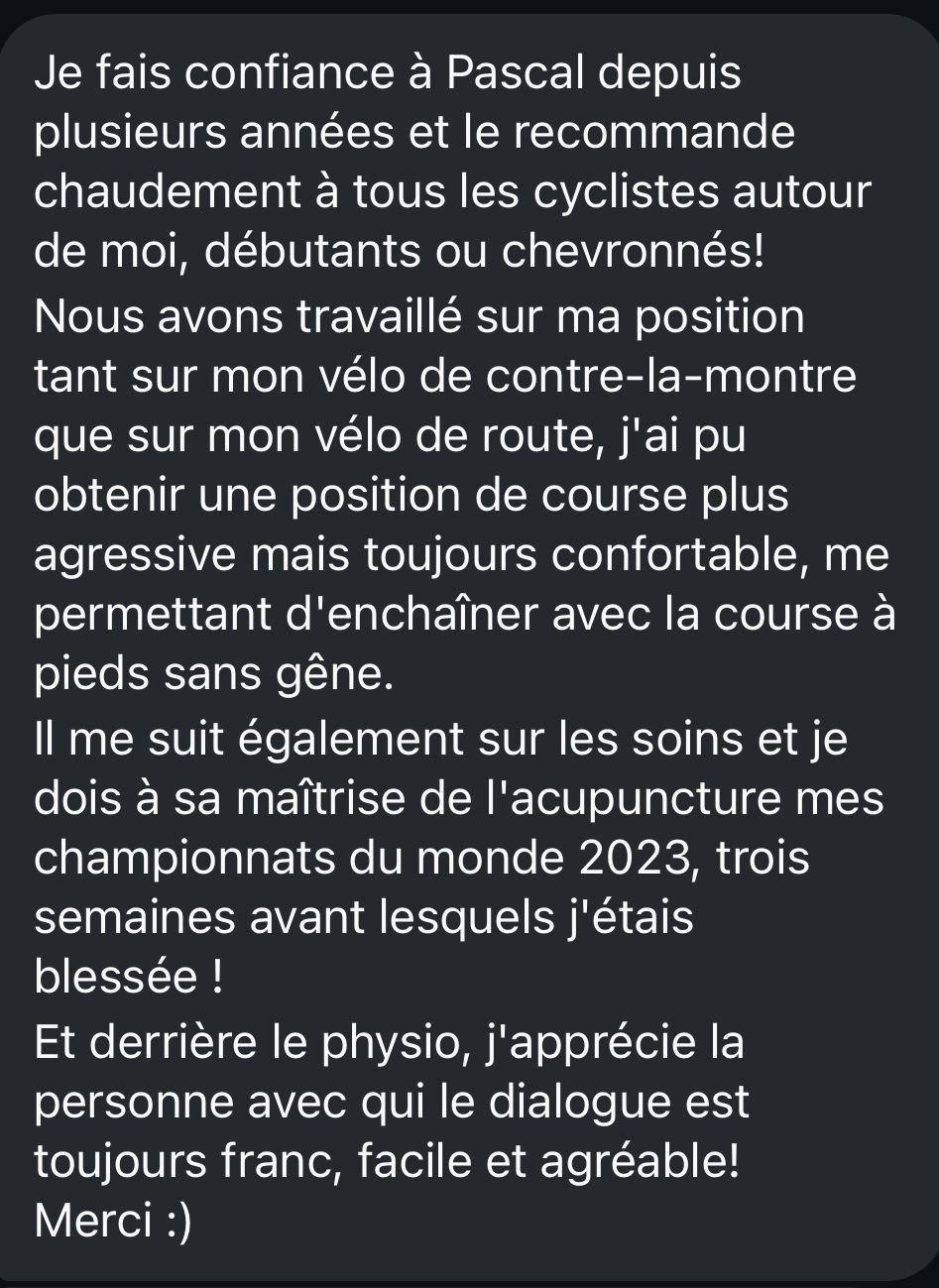 Depuis plusieurs années, je suis au service des athlètes professionnels pour leur récupération, leur suivi santé et depuis 2022 pour leur bike fitting.